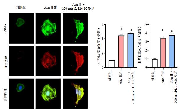 红色表示Ⅲ型胶原,绿色表示α-SMA(平滑肌肌动蛋白α),蓝色表示细胞核,放大倍数200倍;与对照组相比,aP < 0.05;与AngⅡ组相比,bP < 0.05;Lir为利拉鲁肽 图 2 各组成纤维细胞α-SMA和Ⅲ型胶原的表达 Fig 2 The expression levels ofα-SMA and collagen Ⅲ in each group |