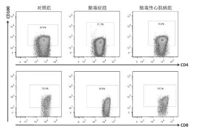 图 1 对照组、脓毒症组和脓毒性心肌病组CD4+ T细胞和CD8+ T细胞表面CD100表达的典型流式细胞检测 Fig 1 CD100 expression on CD4+ T cells and CD8+ T cells by flow cytometry in the control, sepsis, and septic cardiomyopathy groups |