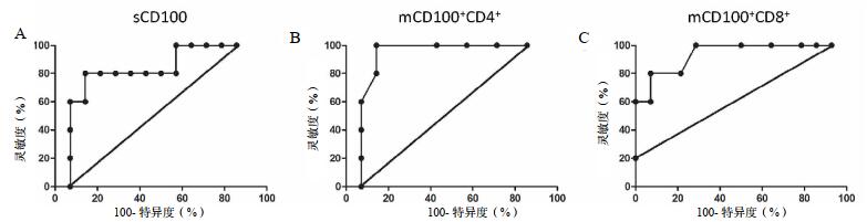 A:sCD100预测患者预后(AUC=0.814,P=0.042);B:mCD100+CD4+T细胞比例预测患者预后(AUC=0.907,P=0.008);C:mCD100+CD8+T细胞比例预测患者预后(AUC=0.935,P=0.004) 图 2 预测脓毒性心肌病预后的ROC曲线 Fig 2 The ROC curve of prognosis of septic cardiomyopath |