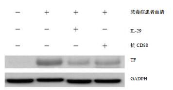 | 图 2 免疫印迹分析抗CD88抗体、IL-29对脓毒症患者血清C5a处理的PMNs上TF表达作用 Fig 2 Western blot analysis of the effects of anti-CD88 antibodies and IL-29 on TF expression from PMNs of healthy volunteers after stimulation with serum-derived C5a of sepsis patients |