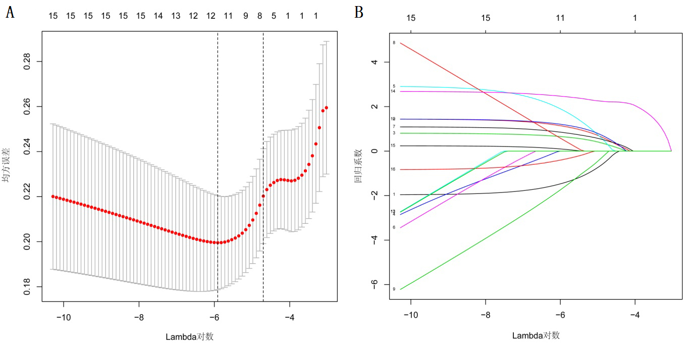 A:采用5倍交叉验证方法选择最优参数(Lamda),均方误差随lambda对数的变化趋势图;B:各变量系数随参数Lambda增大逐步压缩到0示意图 图 1 采取Lasso回归筛选呼吸相关性ICU重回预测因素 |