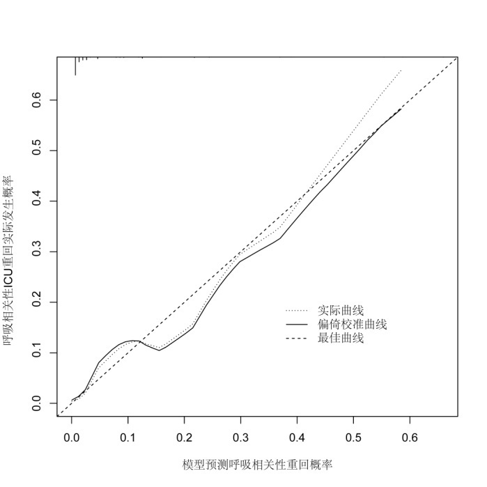 图 3 呼吸相关性ICU重回观察概率与实际发生概率校准图 |