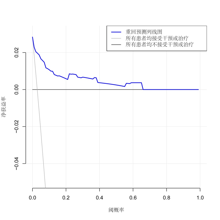 通过Logistic回归或Cox回归进行构建预测模型,仅能以数学公式形式呈现,临床推广性差。本研究采取列线图方式,以图形方式简单清晰地展现各变量得分,临床医务人员可以快速得到患者呼吸相关性ICU重回预测概率,实用性强。同时,考虑到预测模型临床应用价值的最重要关注点应放在患者是否有必要接受相关干预措施。C指数与H-L检验结果仅针对模型的准确性,而模型具有高准确性并不代表患者会从中受益。本研究通过DCA,量化不同阈概率的净获益对于权衡患者接受必要的干预和避免不必要的干预具有重要意义,使用列线图预测患者ICU重回风险并接受干预有助于预防患者发生ICU重回,并从中受益。