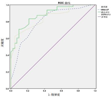 图 1 MNA-SF、SOFA及两者联合预测28 d病死率的ROC曲线图 |