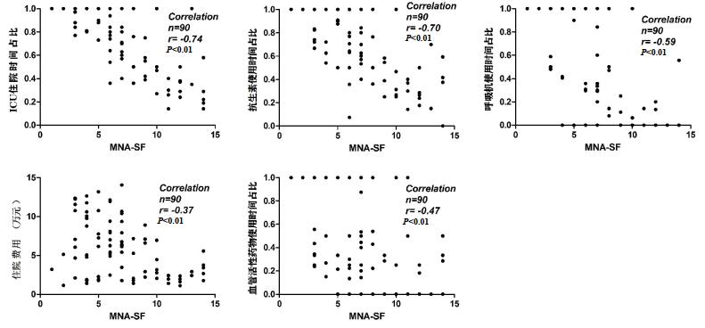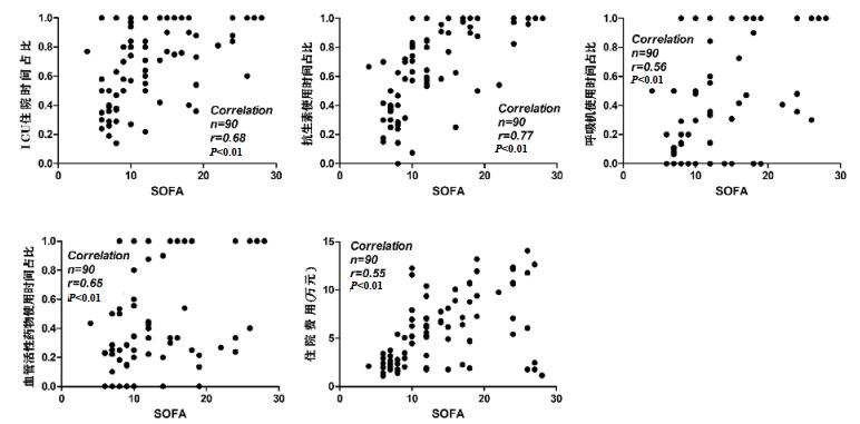 脓毒症患者ICU住院时间占比、血管活性药物使用时间占比、呼吸机使用时间占比、抗生素使用时间占比及住院总费用与MNA-SF均呈负相关,相关系数r分别为-0.74、-0.70、-0.59、-0.47、-0.37,均P < 0.01;而与SOFA评分呈正相关,相关系数r分别为0.68、0.77、0.59、0.65、0.55,均P < 0.01。见图 2~3。