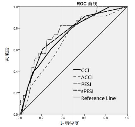 图 1 CCI、ACCI、PESI、sPESI 预测急性肺栓塞30 d全因病死率ROC曲线 |