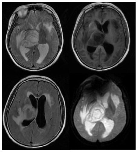 脑诺卡菌病临床表现并无特异性,可表现为头痛、局灶性神经功能缺损、意识障碍、痫性发作等,化验可表现为血白细胞、C反应蛋白、血沉等升高;影像学表现也往往无特异性,典型影像学表现为脑脓肿样病灶,中央液化区在MRI的T2像上表现为各种信号强度交替出现的“同心圆”,与组织坏死碎片的同步液化有关,也可表现为多发病灶。