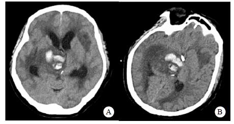 A:右侧丘脑、左侧岛叶病变,伴脑室扩张;B:双侧脑室钻孔引流术后改变,脑室扩张较前(2019-09-29)好转,右侧丘脑、左侧岛叶病变伴出血 图 2 患者2019-09-29头颅CT平扫(A)和2019-09-30头颅CT平扫(B) |