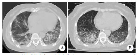 A:两肺间质性肺炎,下叶为著(2019-06-23);B:(2019-09-30)两肺间质性肺炎,下叶为著,较前(2019-06-23)部分好转 图 3 患者胸部HRCT结果 |