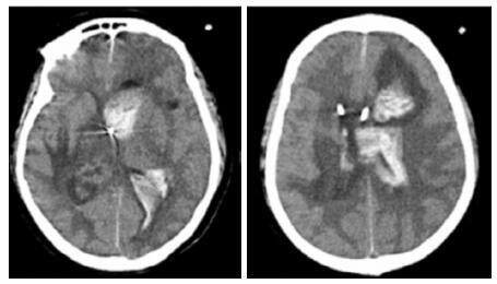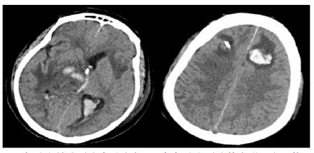 双侧脑室钻孔引流术后改变,双侧侧脑室引流管走形区出血伴血肿形成;右侧丘脑区积液、积血,双侧脑室积血新发 图 4 患者2019-10-06头颅CT结果 |
