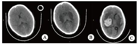 A:入抢救室当日(中毒首日);B:住院第5天(中毒第6天);C:住院第8天(中毒第9天) 图 2 患者头颅CT影像 |