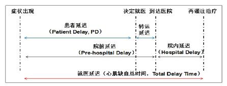 2016年中国急性心肌梗死(acute myocardial infarction,AMI)的发病人数已达400万左右,预计到2030年AMI发病人数将达约610万[1]。研究显示,缺血性心脏病高居我国死亡原因第二位[2]。尽管AMI的治疗方法已取得重大进展,但有效治疗仍存在很大困难。因为AMI治疗获益程度具有很强的时间依赖性,再灌注治疗黄金时间为心肌梗死后1 h[3]。但30%~40%的AMI患者存在院前延迟[4-5],目前我国院前延迟时间中位数为2.3~5.2 h。研究显示,就医时间每延迟1 h,AMI患者的死亡风险将增加10%;每延迟半小时进行再灌注治疗,其1年内死亡风险提高1.076倍[6]。越早抵达医院接受再灌注治疗,心肌缺血总时间越短,越能有效预防恶性心律失常、缺血性卒中等并发症的发生及降低病死率[7]。就医延迟主要由院前延迟(pre-hospital delay,PHD)和院内延迟(hospital delay,HD)两个阶段构成(图 1)。随着医疗机构胸痛中心的不断建设与发展,AMI患者院内流程不断优化,院内延迟时间明显缩短[8],但院前延迟时间未明显改善[9-10]。研究显示,院前延迟时间与心肌缺血总时间呈正相关[11],是AMI患者就医延迟的主要时间段[12-14]。AMI患者院前延迟风险因素分析及预防管理已成为国内外研究热点,本文将相关研究进展综述如下。