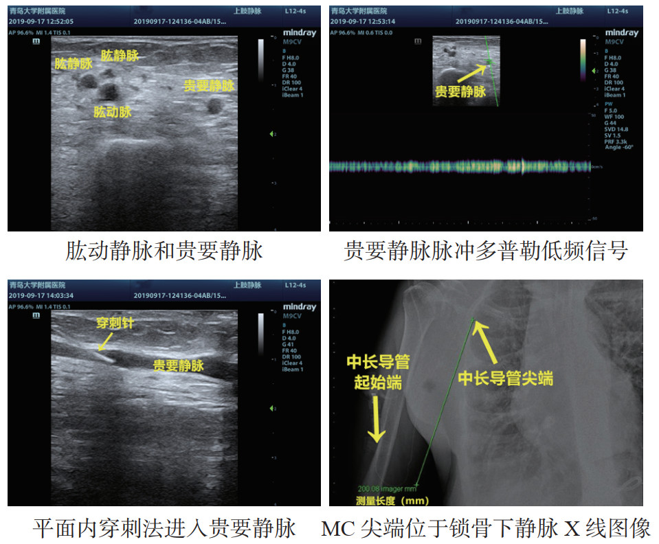 图 1 超声引导中长导管置入超声及X线图像 Fig 1 Ultrasonographic and X-ray images of ultrasound-guided placement of midline catheter |