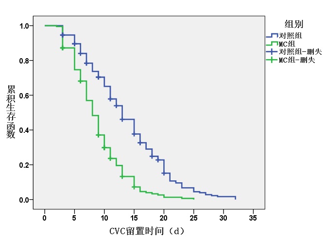 图 2 两组CVC留置时间比较(Kaplan-Meier法) Fig 2 Comparison of the CVC duration between the two groups (Kaplan-Meier method) |