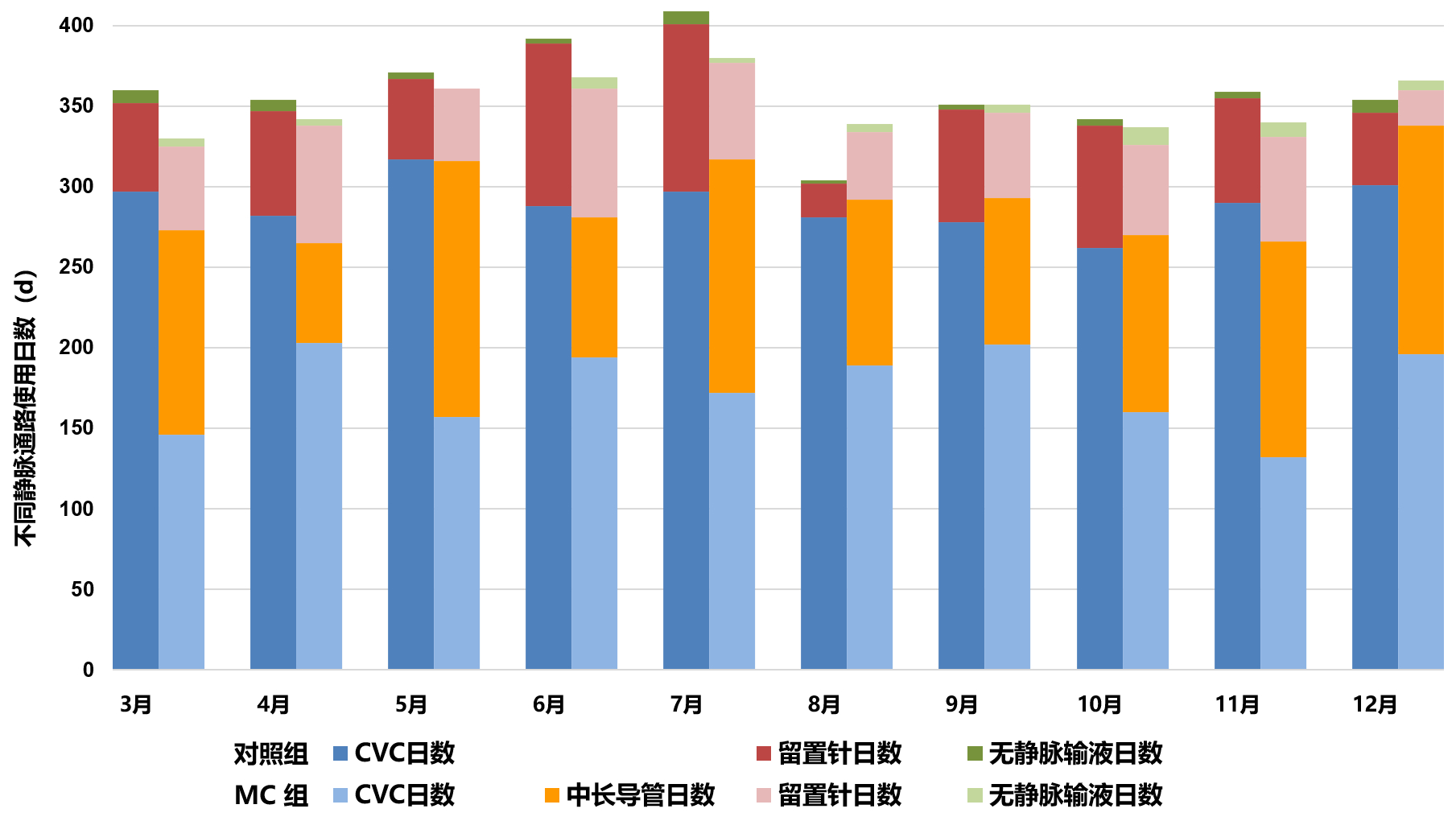 图 3 两组每月CVC、MC、PIV静脉治疗时间比较 Fig 3 Comparison of monthly CVC, midline catheter, and peripheral intravenous catheter duration between the two groups |