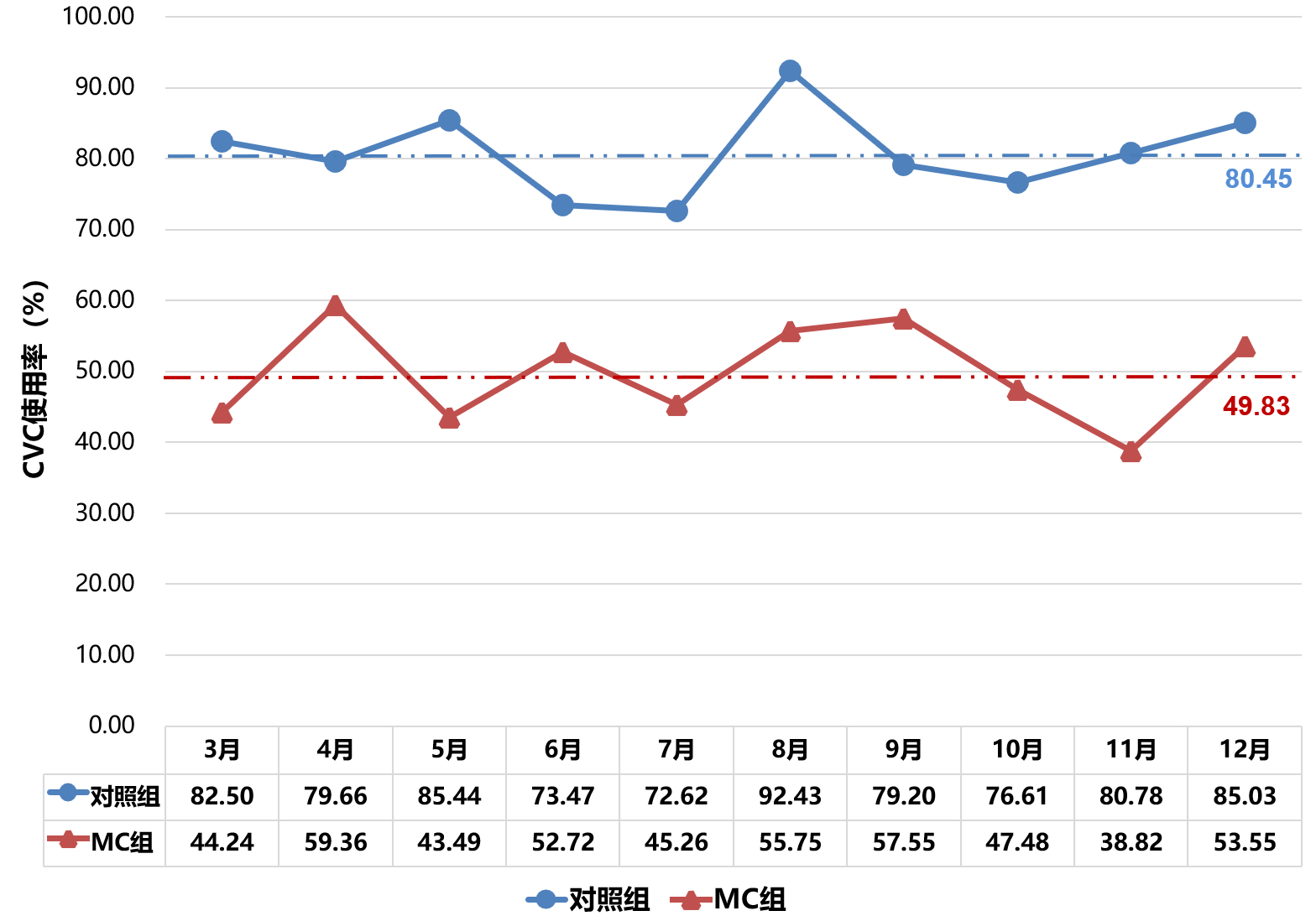 图 4 两组每月CVC使用率比较 Fig 4 Comparison of monthly CVC utilization ratios between the two groups |