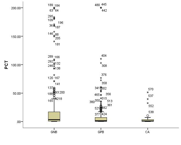 降钙素原(procalcitonin, PCT)是细菌感染的生物标志物,已有研究[2-8]表明,细菌菌血症患者的PCT水平高于念珠菌血症,但PCT在不同革兰染色细菌菌血症和念珠菌血症的鉴别诊断中的作用尚不明确,该研究的目的是探讨PCT血清浓度在不同革兰染色细菌菌血症之间及其与念珠菌血症的鉴别诊断中的价值,为临床上早期选择恰当的抗感染治疗提供思路。