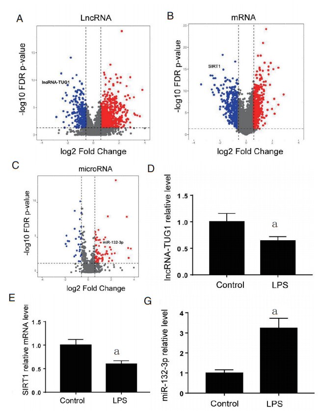 A-C:RNA测序数据显示LPS处理24 h后HIEC-6细胞出现了部分lncRNA、mRNA及microRNA的表达差异;D:qRT-PCR结果显示LPS处理24 h后HIEC-6细胞出了LncRNA-TUG1的表达降低;E-F:qRT-PCR及western blot的结果显示LPS处理24 h后HIEC-6细胞的SIRT1 mRNA及蛋白水平出现降低;G:qRT-PCR结果显示LPS处理24 h后HIEC-6细胞出了LncRNA-TUG1的表达降低。与对照组比较,aP < 0.05 图 1 脂多糖处理24 h后的HIEC-6细胞出现lncRNA-TUG1、miR-132-3p及SIRT1的表达变化 Fig 1 Expression changes of LncRNA-TUG1, miR-132-3p and SIRT1 in HIEC-6 cells treated with LPS for 24 h |