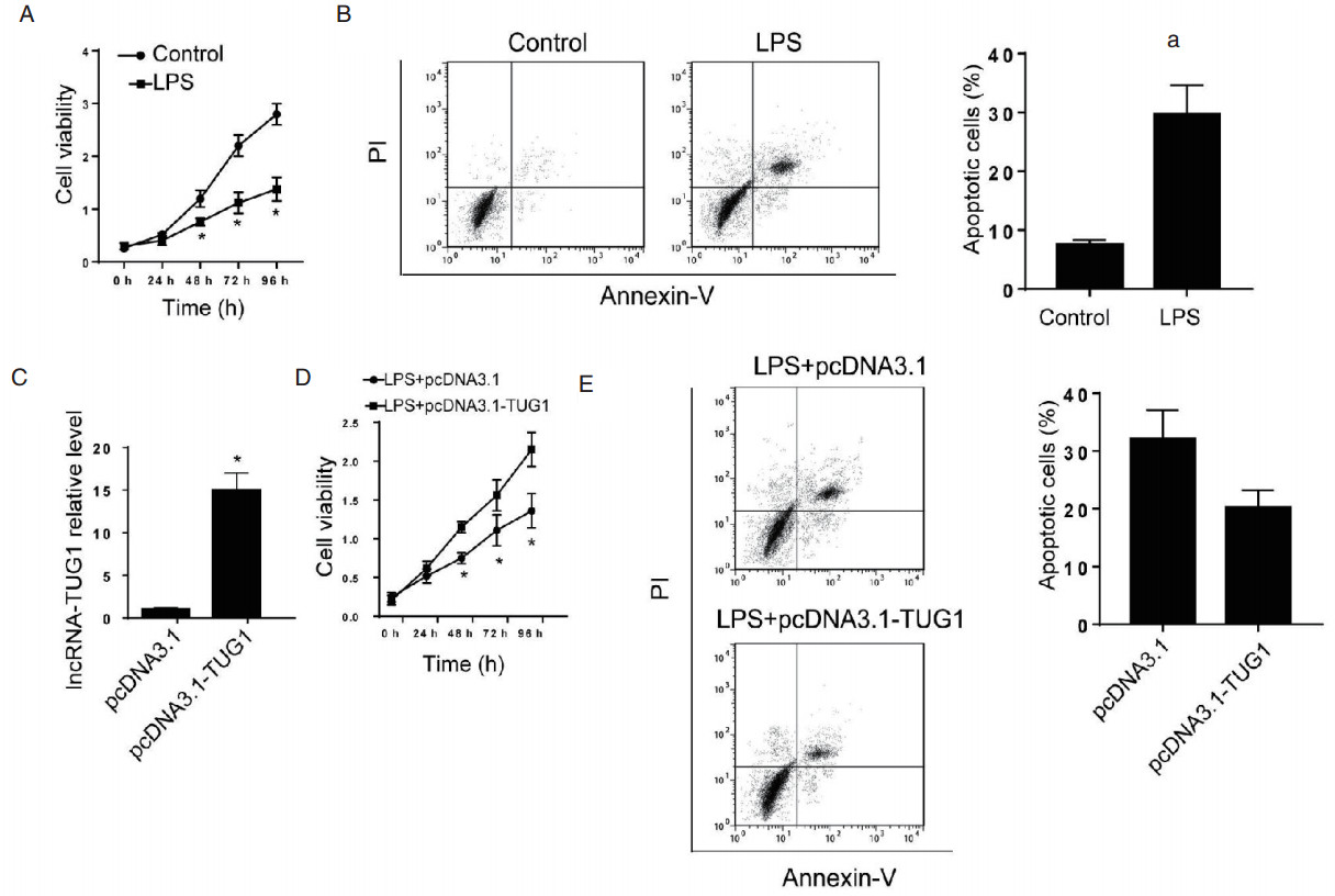 LPS处理可以有效抑制HIEC-6细胞的增殖(图 2A),并诱导凋亡(图 2B);在过表达LncRNA-TUG1后(图 2C)再使用LPS处理细胞,可以发现LPS引起的细胞损伤得到减轻,与未经转染的细胞相比,过表达LncRNA-TUG1的细胞增殖抑制减少(图 2 D,t=6.55,P < 0.05),凋亡减少(图 2 E,t=3.94,P < 0.05)。