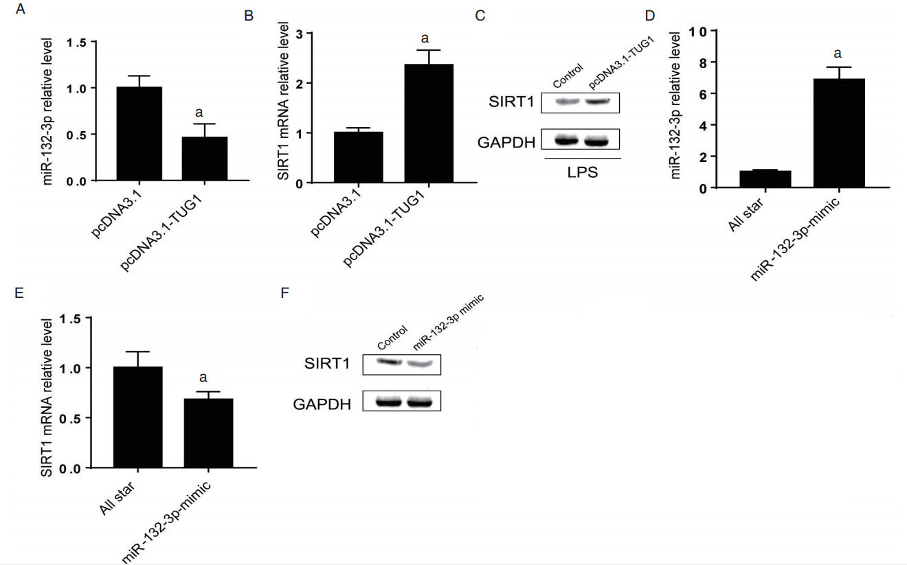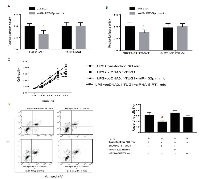 1.5 qRT-PCRTrizol试剂提取LPS处理24 h或转染48 h后的各组细胞的总RNA。对总RNA样本进行质量及定量检测后进行cDNA的反转录。为检测LncRNA-TUG1和SIRT1 mRNA,提取的RNA使用RevertAid H Minus Reverse Transcriptase试剂盒进行反转录,得到的cDNA使用SYBR Green qPCR Master试剂盒进行扩增定量。LncRNA-TUG1的上游引物为:5’-TAGCAGTTCCCCAATCCTTG-3’下游引物为:5’- CACAAATTCCCATCATTCCC-3’。SIRT1的上游引物为:5’- TAGCCTTGTCAGATAAGGAAGGA-3’下游引物为:5’- ACAGCTTCACAGTCAACTTTGT-3’。内参GAPDH的上游引物为:5’- TGTGGGCATCAATGGATTTGG-3’下游引物为:5’- ACACCATGTATTCCGGGTCAAT-3’。为检测miR-132-3p,总RNA使用miRNA First Strand cDNA合成试剂盒进行反转录。合成的cDNA使用MicroRNAs qPCR试剂盒进行扩增定量;miR-132-3p的上游引物为:5’- TAACAGTCTACAGCCATGGTCG-3’下游引物为试剂盒内通用引物。内参U6的上游引物为:5’- CTCGCTTCGGCAGCACA-3’下游引物为:5’- AACGCTTCACGAATTTGCGT-3’。目的基因的相对表达量采用2-△△CT法进行计算。