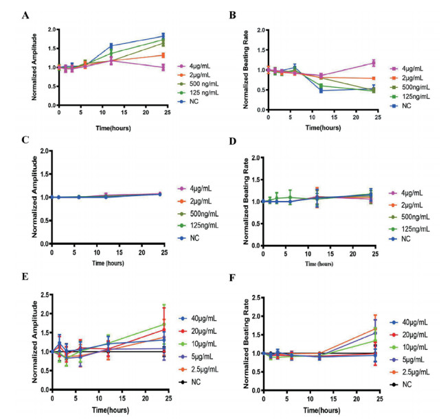 原代新生大鼠在LPS(0~4 μg/mL)作用下的搏动幅度(A)和搏动频率(B);hiPS-CMs在低浓度LPS(0~4 μg/mL)作用下的搏动幅度(C)和搏动频率(D)和hiPS-CMs在高浓度LPS(2.5~40 μg/mL)作用下的搏动幅度(E)和搏动频率(F) 图 1 LPS对hiPS-CMs和原代新生大鼠CMs的收缩作用 Fig 1 Contractile effect of LPS on hiPS-CMs and neonatal rat CMs |