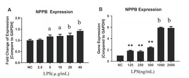 不同LPS浓度(范围为2.5 μg/mL至4 μg/mL)对hiPS-CMs的NPPB的表达没有明显改变;当LPS浓度逐步增加到40 μg/mL时,NPPB的表达水平呈剂量依赖性上升(图 2A)。在原代新生大鼠CMs中,LPS导致NPPB mRNA表达在125 ng/mL到2 μg/mL范围内就显著上调(图 2B)。这些结果表明,与hiPS-CMs相比,LPS诱导更容易导致原代新生大鼠CMs的心肌损伤。
