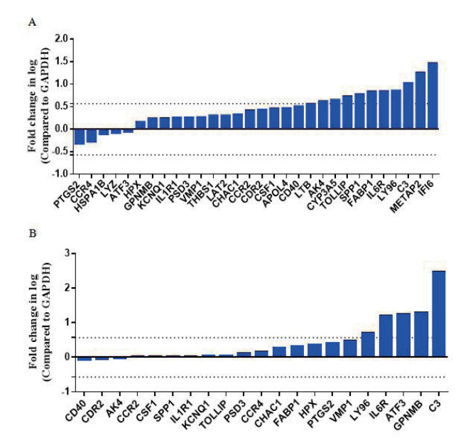 通过之前在hiPS-CMs和原代新生大鼠CMs中报道的炎症相关基因来评估LPS可能启动的炎症分子机制,如图 3所示,在LPS处理下,hiPS-CMs中的AK4、TOLLIP、SPP1、FABP1、IL6R、LY96和C3(图 3A)均上调至1.5倍;与hiPS-CMs中炎症相关基因的表达有所不同,原代新生大鼠中上调1.5倍的基因为:C3、Gpnmb、Atf3、Il6r和Ly96(图 3B)。这些结果表明,在LPS诱导下,hiPS-CMs和原代新生大鼠CMs的部分基因表达存在明显差异,而这些不同表达模式变化的潜在机制需要进一步研究。