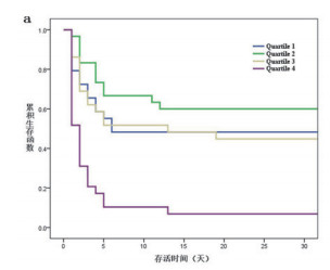 图 3 4组百草枯中毒患者Kaplan-Meier生存曲线 Fig 3 The Kaplan-Meier curve of patients with paraquat poisoning in Quartiles 1, 2, 3 and 4 |