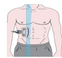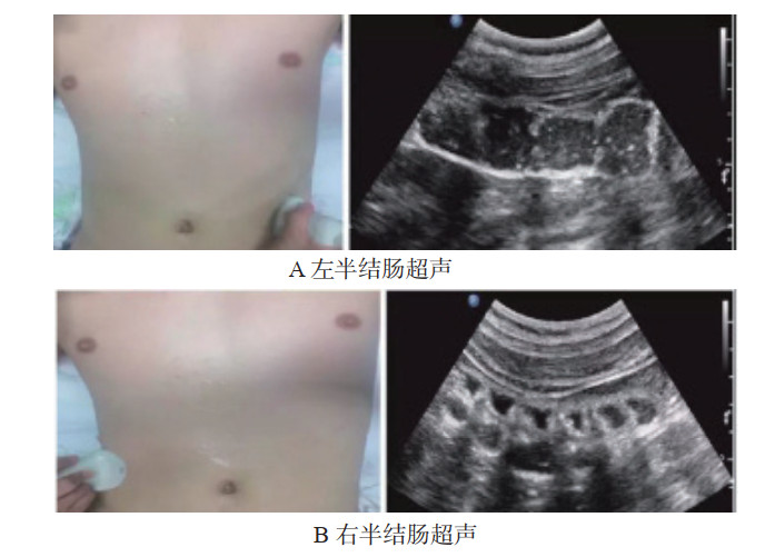 选用上述2~5 MHz凸阵超声探头。左/右半结肠超声:凸阵探头置于左/右侧腹,沿降结肠走向,由上至下纵向滑动扫查,必要时可旋转探头90°,增加横向滑动扫查[3]。详见图 3。