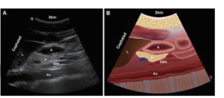 1.2.1 ①胃窦超声评估利用床旁超声机Sonosite M-Tube进行检测,利用2~5 MHz凸阵探头,患者取仰卧位或右侧卧位(因病情危重无法右侧卧位者取仰卧位),床头抬高30~45°,探头方向与身体纵轴平行,在剑突下于正中矢状线右侧获取清晰胃窦部超声[1],见图 1。