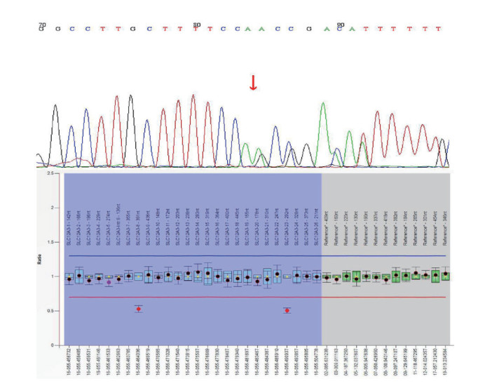 1 资料与方法患者1,男性,15岁。因“反复四肢酸痛无力2年余,再发伴加重3 d”入院。患者自幼有嗜盐,体质瘦弱,无多饮多尿、遗尿。该患者系领养,家族史不详。入院后查:BP 116/72 mmHg(1 mmHg=0.133 kPa),发育正常,四肢肌力4级,双下肢腓肠肌压痛。实验室检查提示低血钾、低血镁、肾脏失钾、低钙尿、代谢性碱中毒、肾素激活、CK升高(见表 1)。氢氯噻嗪试验,氯离子排泄分数在用药前后变化为-0.246%,提示对氢氯噻嗪刺激无反应。取患者外周血,用二代基因测序法(Next Generation Sequencing, NGS)测序,找到突变位点后,采用一代测序(Sanger法)进行验证。测序结果发现患者SLC12A3基因携带一个杂合突变(图 1A):c.965-1_976delGCGGACATTTTTGinsACCGAAAATTTT,为剪切位点突变,基因缺失/重复性分析显示SLC12A3基因23号外显子疑似杂合缺失。进一步行多重连接探针扩增技术(Multiplex Ligation-dependent Probe Amplification, MLPA)检查,发现SLC12A3基因外显子8和23杂合缺失(图 1B),为新发突变。结合患者临床表现,实验室检查及基因检测结果,诊断为GS。患者入院后补钾补镁治疗。治疗后患者双下肢乏力酸痛消失,复查CK 80U/L,CK-MB 11U/L。
