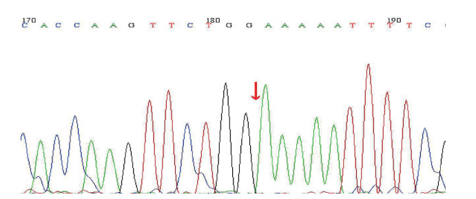 图 2 患者2基因检测结果:SLC12A3基因有1个纯合突变:c.965-1_976del GCGGACATTTTT Gins ACCGAAAATTTT(箭头),为剪切位点突变。 |