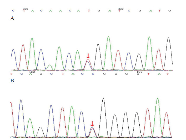 图 3 患者3基因检测结果:SLC12A3存在一个复合杂合突变。A. 杂合突变1:c.179C > T(编码区第179号核苷酸由胞嘧啶变异为胸腺嘧啶),导致氨基酸改变p.T60M(第60号氨基酸由苏氨酸变异为甲硫氨酸),为错义突变; B.杂合突变2:c.961C > T(编码区第961号核苷酸由胞嘧啶变异为胸腺嘧啶),导致氨基酸改变p.R321W(第321号氨基酸由精氨酸变异为色氨酸),为错义突变。 |