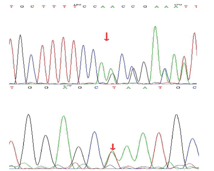 图 4 患者4基因检测结果:SLC12A3存在一个复合杂合突变。A.杂合突变1:c.965-1_976delGCGGACATTTTTGinsACCGAAAATTTT(箭头),为剪切位点突变; B.杂合突变2:c.2599A > T(p.K867X)(箭头),为移码突变。 |