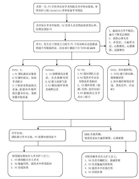 1.3.2 应急反应流程的设计本中心基于不断临床实践,于2015年5月行团队讨论后组建由以上人员组建的救护流程,并在不断实践和反馈中优化改进,见图 1。(1)术前一日流程:①心内介入医生专科群提前一天告知手术患者基本情况,给出一线待命(导管室待命,循环机预充完成)和呼叫待命(院内待命,需着外科手术服,3 min到达导管室)指令,相关人员回复“已知晓”; ②护士根据清单确认表核实医疗设备、器械到位情况。(2)术日术前流程:N1负责接待患者、准备手术常规物品; N2根据清单再次确认设备、器械、人员到位情况,将结果反馈给P1。(3)术中流程:①即刻急救:如发生循环崩溃,P1负责胸外按压,P2归位导管床轮流胸外按压,A1使用抢救药物,A2全麻诱导后气管插管,A3负责麻醉记录; 超声医生撤出食道超声; N1将胸外按压支撑架垫于导管床下(必要时先除颤),T将垫脚凳分别置于A1A2和P1脚下便于急救操作,N4整理操作台面,保持操作台面整洁有序。②通知人员:若患者循环支持尚可,P1决策院内待命升级为为现场待命; 发生循环崩溃,N1和N2分别通知S1S2和体外循环师,告知到达后是否立即预充体外循环机,按计划启动N3,备好手术所需铅衣。③无菌转流物品管理:N2将转流物品打至手术台上,负责护理记录及添加术中物品,N4负责冲洗管道; N1负责穿手术衣及连接管路。④人员设备位置管理:T协助N1撤离非急救设备,调整导管室内仪器摆放位置,确保线路简洁、设备性能正常。N1负责物品和人员协调,遇术中紧急会诊,确保支援人员最短时间到达手术间。⑤注意事项:P1为术中最高决策者,根据病情变化作出正确判断; P2联系他科会诊医生,术中家属知情签字谈话。