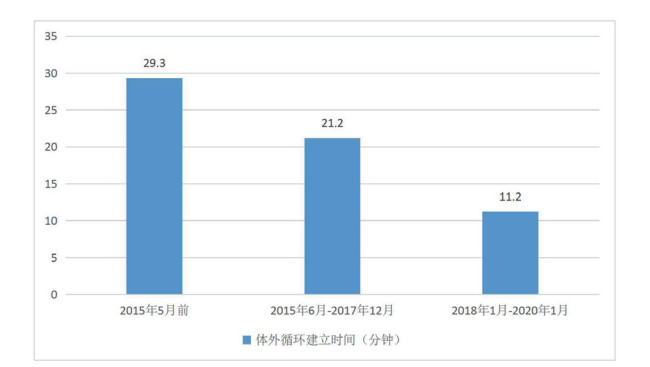 2 结果13例患者体外循环建立时间在13~33 min,平均20 min,2015年5月前的循环建立时间平均为29.3 min,2015年6月至2017年12月为21.2 min,2018年1月至2020年1月为11.2 min。12例患者手术顺利返回ICU, 1例患者导管室内死亡。见图 2。