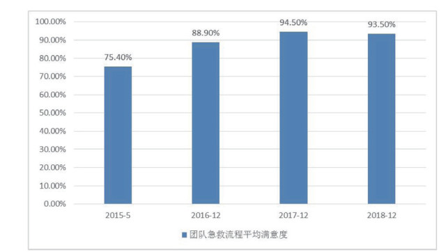 2015年5月,TAVR团队14人,团队急救流程平均满意度75.4%;2016年12月,TAVR团队17人,团队急救流程平均满意度88.9%;2017年12月,TAVR团队20人,急救流程平均满意度94.5%;2018年12月,TAVR团队22人,满意度93.5%;2019年12月,TAVR团队25人,急救流程平均满意度95.5%。见图 3。