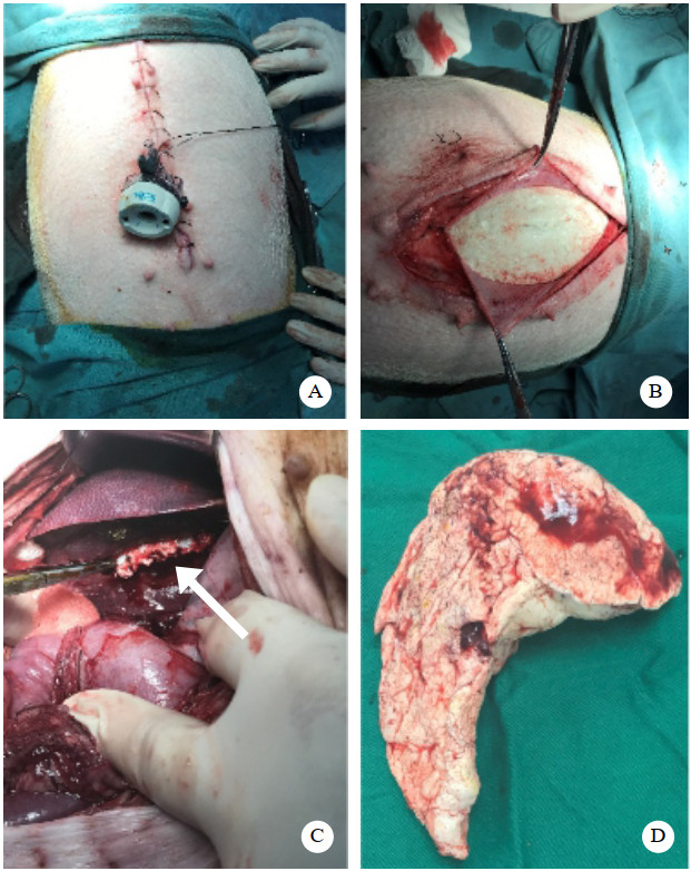 | A:经腹腔穿刺器注入聚氨酯泡沫材料;B:泡沫填塞止血;C:泡沫材料自塑形进入创面填塞止血(箭头处为进入肝脏创面内部的聚氨酯泡沫材料);D:填塞材料完整取出,无残留 图 1 泡沫材料的置入 Fig 1 Foam deployment |