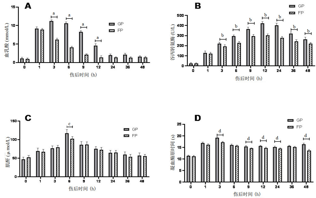 BC组在建模后血乳酸水平、血常规、肝肾功能及凝血功能指标均迅速恶化,2 h内均未见改善。动脉血乳酸水平建模后FP组和GP组均持续升高,1 h时FP组达峰后迅速降低,至12 h恢复正常。GP组动脉血乳酸水平于3 h达峰,显著高于FP组最高值[(11.2±0.3)mmol/L vs(8.9±0.3)mmol/L,P < 0.01],后逐渐恢复,至48 h恢复至正常水平。3 h至12 h之间,FP组乳酸水平显著低于GP组(P < 0.01)。GP组、FP组谷丙转氨酶(ALT)均有先升高后下降的趋势,均于伤后12 h达到最高,并逐渐恢复;自伤后3 h开始,FP组ALT均显著低于GP组(P < 0.01)。GP组、FP组肌酐(Cr)均在伤后呈现先升高后降低的趋势;伤后6 h,GP组Cr高于FP组[(117±10.2)μmol/L vs(102.4±5.7)μmol/L,P < 0.01]。凝血酶原时间(PT)在GP组、FP组伤后前3 h均逐渐延长随后逐渐恢复,在伤后3、9、12、24和48 h,GP组PT均长于FP组(P < 0.01)(图 4)。