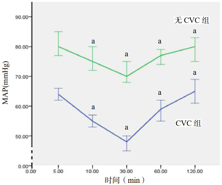MAP为平均动脉压;和前一时间点相比,aP < 0.05 图 1 气管插管后严重CVC组和无严重CVC组平均动脉压变化 Fig 1 Changes of mean arterial pressure in the severe CVC group and non-severe CVC group after endotracheal intubation |