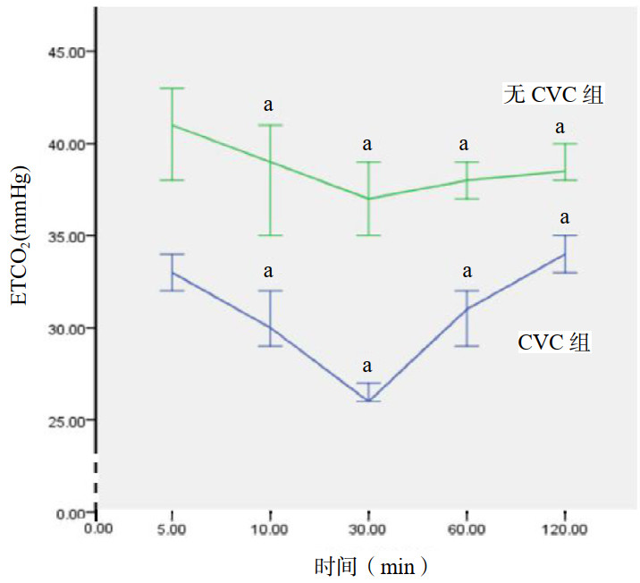 ETCO2为呼气末二氧化碳;和前一时间点相比,aP < 0.05 图 2 气管插管后严重CVC组和无严重CVC组呼气末二氧化碳变化 Fig 2 Changes of end expiratory carbon dioxide in the severe CVC group and non-severe CVC group after endotracheal intubation |