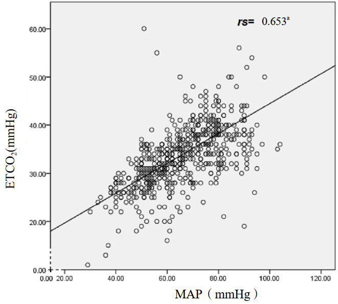MAP为平均动脉压;ETCO2为呼气末二氧化碳;aP < 0.01 图 3 116例气管插管后患者平均动脉压和呼气末二氧化碳的相关性分析 Fig 3 Correlation between mean arterial pressure and end expiratory carbon dioxide in 116 patients after endotracheal intubation |