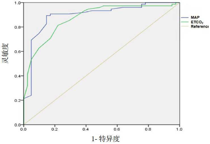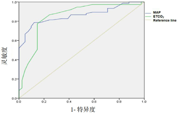 MAP为平均动脉压;ETCO2为呼气末二氧化碳 图 4 气管插管后5 min平均动脉压和呼气末二氧化碳对严重CVC预测的ROC曲线 Fig 4 ROC curve of mean arterial pressure and end expiratory carbon dioxide at 5 min after endotracheal intubation for predicting severe CVC |