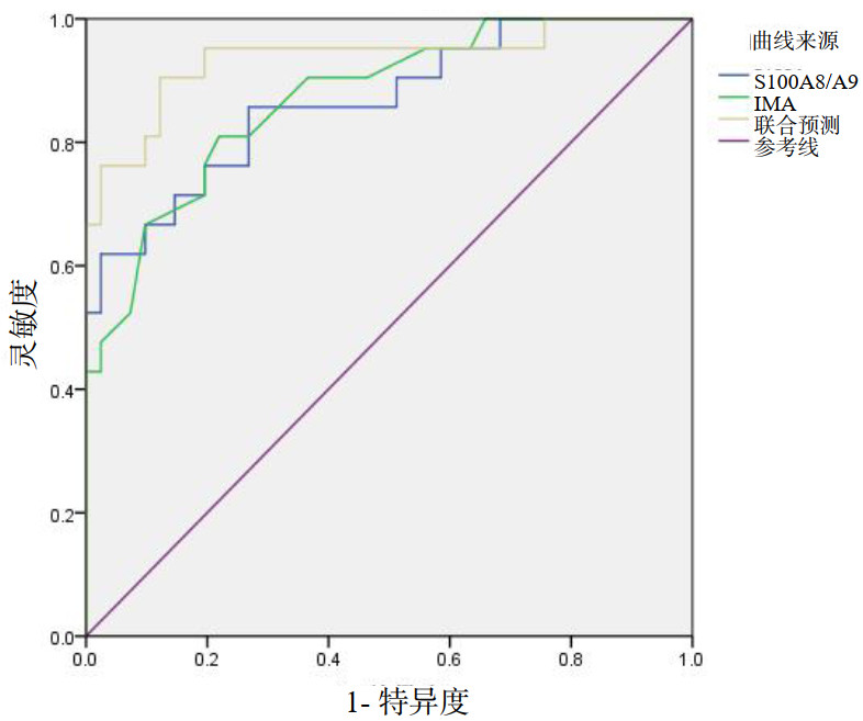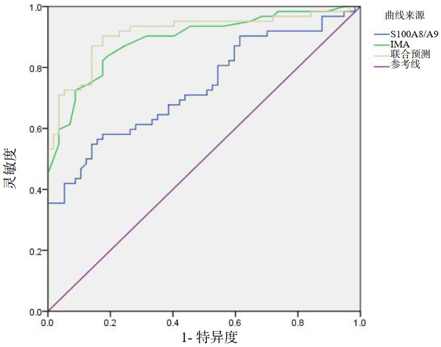 图 2 S100A8/A9、IMA及两者联合诊断非单纯性急性阑尾炎的ROC曲线 Fig 2 ROC curve of S100A8/A9, IMA and their combination in the diagnosis of non-simple acute appendicitis |
