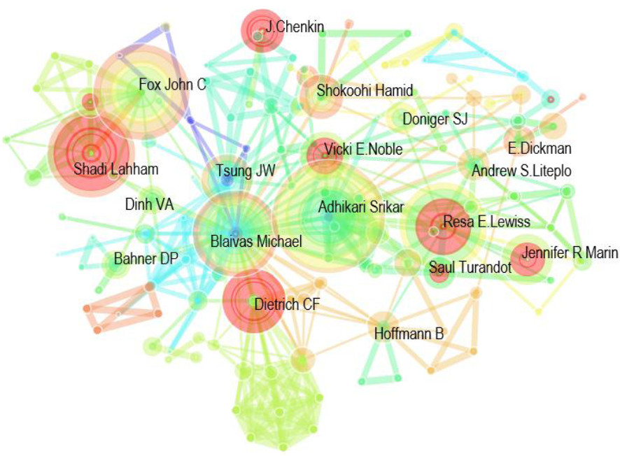 从国家和研究机构力量分布上看,美国、加拿大及意大利是PoCUS技术研究领域论文发表的主要国家。中国在该领域的发文量目前较少,排名全球第9位,表明我国研究人员对该领域的投入力度有待增强,未来我国应多重视该领域的技术发展。在中介中心性方面,美国、英国、德国的中介中心性最大,从国家共现网络可以看到,美国、英国和德国与其他国家的学术交流也较为密切。在科研机构方面,国际上发文量排名前10位的机构全部位于美洲。在国内机构中,发文量居前3位的机构依次是四川大学华西医院、北京协和医院、解放军总医院,这些机构代表了国内在该领域的最高科研力量。相较于国外机构,我国科研机构的发文量处于劣势,英文文献发文量明显不足,以后还需加强在国际上的话语权。通过作者共现网络可以看出,对PoCUS技术领域的研究在全球形成多个作者合作团体,其中以Adhikari Srikar为中心的研究团体最为突出,但各团体之间分布较疏散,表明学术交流有待加强。在发文量上,内布拉斯加大学医院的Adhikari Srikar、加利福利亚大学欧文分校医院的Fox John C、乔治亚医学院的Blaivas Michael等发文量最大,其文章在一定程度上代表着该领域的最新动态。国内发文量位于前3位的作者分别是台州市中西医结合医院的陈卫挺、四川大学华西医院的尹万红和河北省人民医院的赵浩天,均为我国重症医学领域的知名学者。