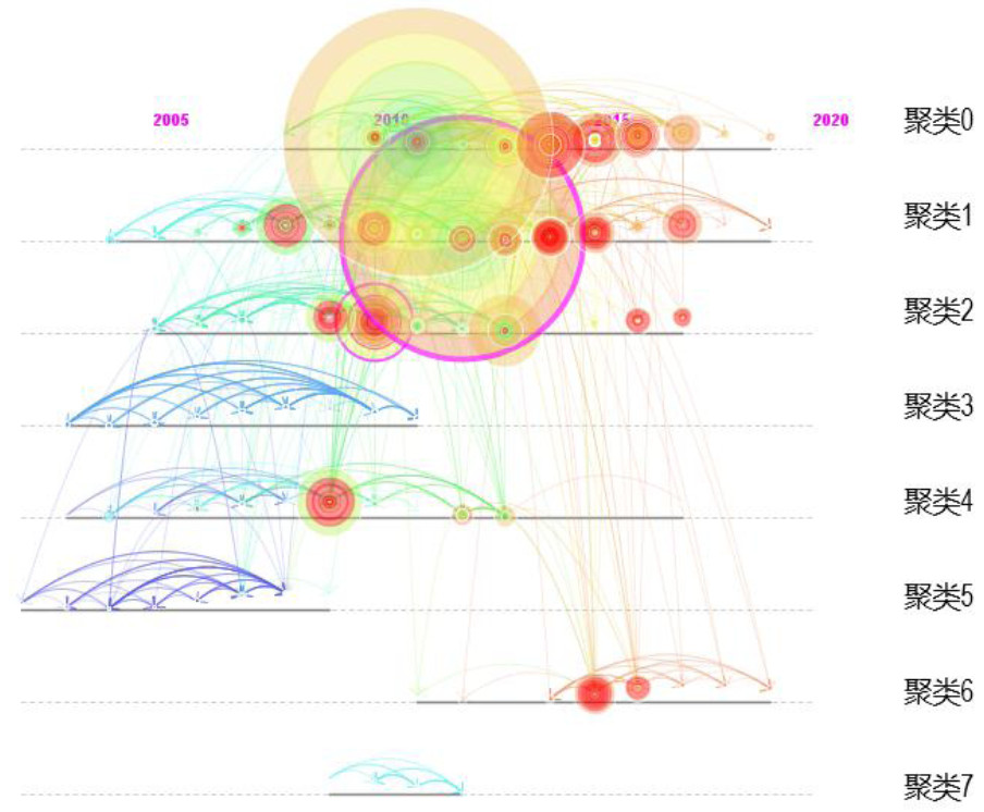 图 7 2010至2020年Web of Science中PoCUS研究领域文献共被引网络前8位大型聚类Timeline图 |