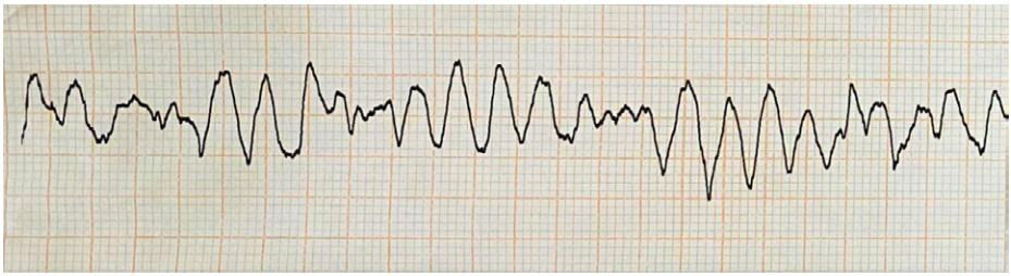 图 3 患者2019-12-03 18:53心电图示室颤 |