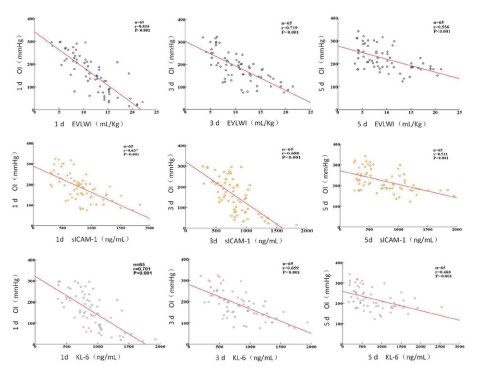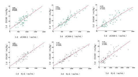 重症肺炎ARDS患者在入住RICU治疗1 d、3 d和5 d时的sICAM-1、KL-6、EVLWI与OI均呈负显著相关(P < 0.01),但随着治疗时间的延长,OI均有所上升,但相关性均有所下降,r分别为0.536、0.511和0.468,见图 1。sICAM-1、KL-6与EVLWI在1 d、3 d、5 d均呈正显著相关(P < 0.01),见图 2。