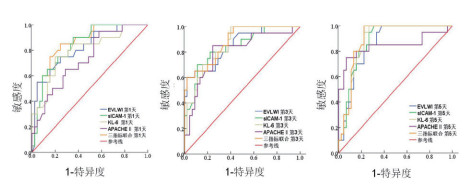 入住RICU第1天、3天和5天时,sICAM-1、KL-6和EVLWI三指标联合预后评估的敏感度和特异度分别为75.0%、84.4%;85.0%、66.7%和80.0%、86.7%。AUC分别为0.864、0.881、0.892。三指标联合预后评估价值均大于单个指标的预测值,分别见表 4和图 3。
