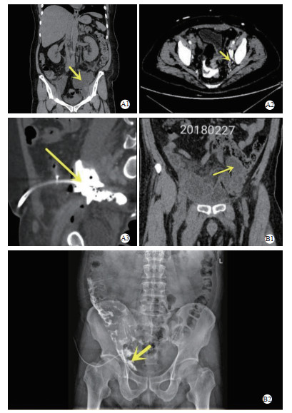A1-3:病例11子宫内膜癌术后患者A1:盆腔淋巴囊肿并感染;A2-3脓腔和乙状结肠连通;B1-2:病例8膀胱癌回肠新膀胱术后患者B1:盆腔囊肿并感染;B2脓腔和回肠代新膀胱连通 图 1 两例脓腔和附近器官连通影像学表现 Fig 1 Imaging features of the connections between the infected lymphocyst and surrounding organs in two patients |